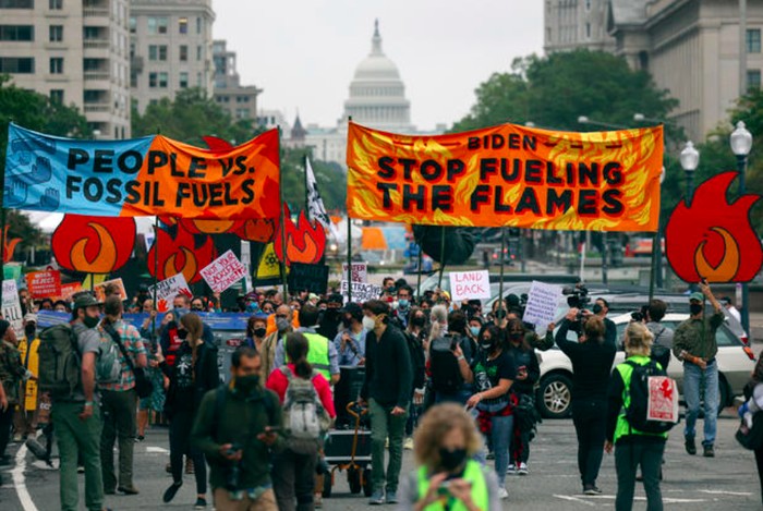 Pengunjuk rasa berbaris di luar Gedung Putih pada 12 Oktober 2021 di Washington, DC. Kelompok tersebut mendesak pemerintahan Biden untuk mengambil tindakan kebijakan yang lebih tegas terhadap krisis iklim. Foto: CBS News
