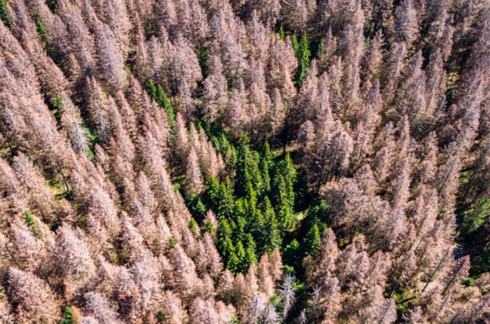 Dalam gambar drone yang diambil pada bulan Mei 2020 ini, kekeringan mengeringkan pohon cemara di wilayah pegunungan Harz, Jerman. Kekeringan seperti ini semakin sering terjadi di Jerman, dan banyak ilmuwan menghubungkan tren ini dengan pemanasan global. Foto: CBS News