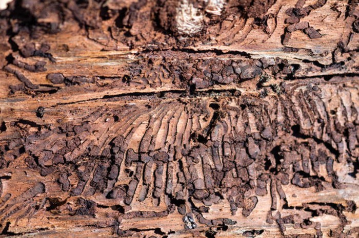Lahan hutan yang kering lebih rentan terhadap hama seperti kumbang kulit kayu. Puluhan ribu ekosistem hutan di Amerika Utara dan Eropa telah secara permanen dirusak oleh kumbang kulit kayu. Pada foto tampak saluran makan kumbang kulit kayu di pohon cemara mati di kawasan pegunungan Harz pada 7 Mei 2020, dekat Wernigerode, Jerman. Foto: CBS News