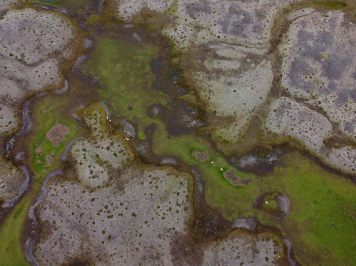 Dalam pemandangan udara ini, domba merumput di rawa-rawa hijau di samping lahan yang jauh lebih kering dan kurang bervegetasi tidak jauh dari surutnya gletser Breidamerkurjokull pada 18 Agustus 2021, dekat Hof, Islandia. Foto: CBS News