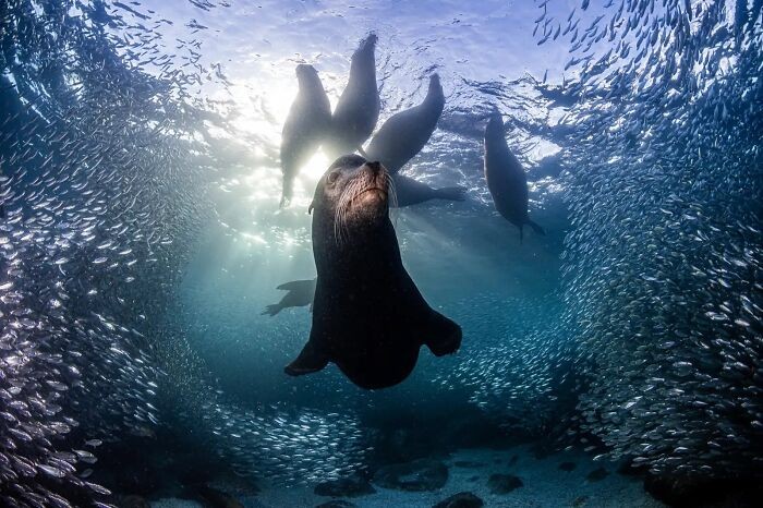 Jawara Wild Portaits: Simon Biddie, Inggris. Dibandingkan dengan singa laut betina, singa laut California jantan berukuran lebih besar, memiliki leher lebih tebal, dan memiliki jambul sagital abu-abu yang menonjol. Selama musim kawin, pejantan menjadi teritorial dan melindungi haremnya yang berisi hingga 30 betina. Singa laut di kawasan ini jumlahnya bertambah banyak dibandingkan koloni lain di Meksiko. Hal ini berkat perlindungan yang ditawarkan dengan menjadi situs Warisan Dunia UNESCO dan Taman Laut Nasional, di mana zona larangan mengambil melindungi seluruh rantai makanan, menyediakan sumber makanan yang kaya bagi singa laut. Foto: Nature TTL Photographer of the Year