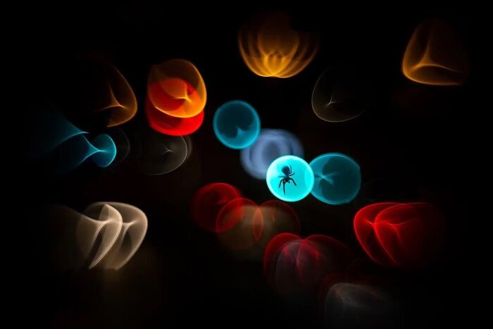 Pemenang kedua kategori Urban Wildlife diraih Simone Baumeister, Jerman. "Saya benar-benar ingin memotret malam itu. Namun tanpa cahaya, hal ini selalu sulit. Jadi, saya pergi ke jembatan penyeberangan yang menawarkan pemandangan langsung ke salah satu persimpangan lalu lintas utama di kota kami. Banyak sekali laba-laba di pagar jembatan ini. Dengan menggunakan lensa analog lama, saya memotret seekor laba-laba di depan lampu warna-warni persimpangan kota yang banyak mobil" Foto: Nature TTL Photographer of the Year