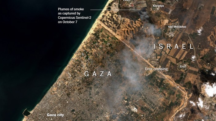 Inilah foto satelit dari Sentinel 2 memotret dampak kerusakan Israel usai serangan roket Hamas. Ini adalah pos perbatasan Erez antara Jalur Gaza dan Israel. Tampak asap membumbung dari wilayah Israel di sekitar Erez. Foto: (Copernicus Sentinel 2/The Washington Post)