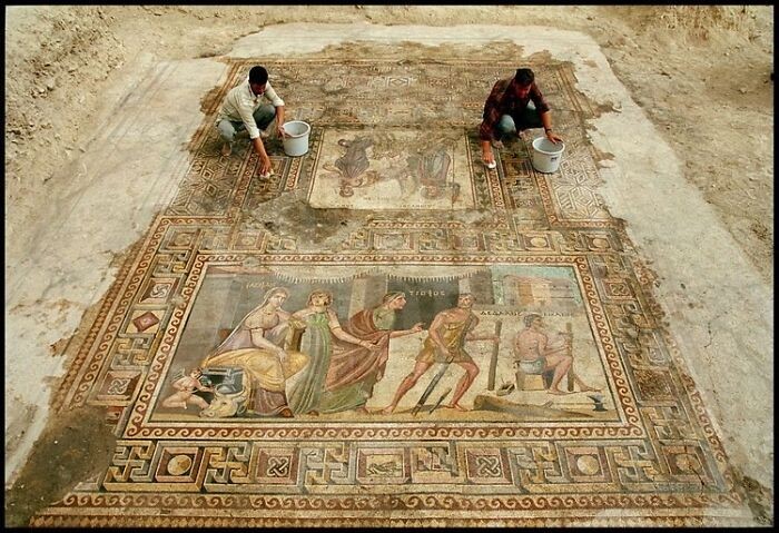 Mosaik Romawi Zeugma (Turki) yang megah. Terletak di Turki Tenggara, Zeugma, yang secara harfiah berarti βjembatanβ atau βpenyeberanganβ dalam bahasa Yunani kuno, mendapatkan namanya karena lokasinya di titik penyeberangan kuno utama di sungai Efrat. Istilah kuno Zeugma sebenarnya mengacu pada kota kembar di tepian sungai yang berseberangan. Itu adalah pemukiman Helenistik yang didirikan oleh komandan Seleucus Nicator sekitar tahun 300 SM. Foto: FB/History Archaeology People