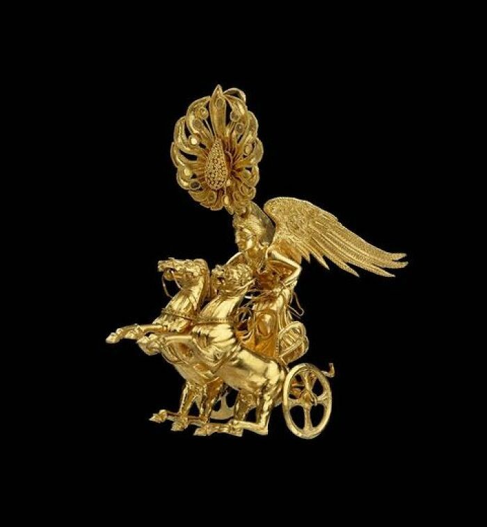 Anting-anting megah dengan gambar Dewi Nike mengendarai kereta dua kuda. Dibuat pdi Yunani pada periode klasik akhir atau Helenistik Awal sekitar 350β325 SM. Punya tinggi 5cm dan berat 15,8 gram. Terbuat campuran emas dan enamel . Foto: FB/History Archaeology People