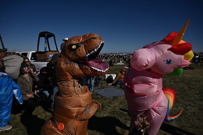 Lalu ada yang lucu. Contohnya seperti dua orang ini yang melihat gerhana menggunakan kostum unicorn dan dinosaurus di Albuquerque International Balloon Fiesta ke-51 di New Mexico, Amerika. Foto:Β (Patrick T. Fallon/AFP/Getty Images).