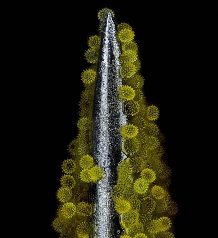 Juara keempat belas diraih John-Oliver Dum. Menampilkan gambar Serbuk sari bunga matahari pada jarum akupunktur Foto: Nikon Small World Photomicrography
