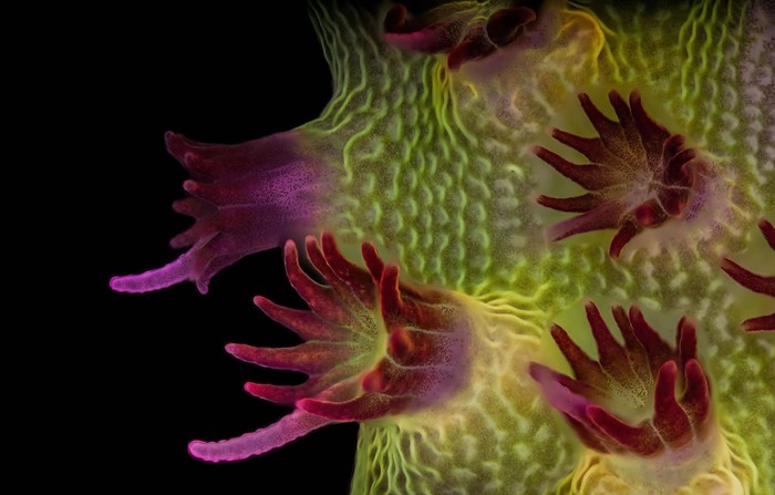 Juara kelima belas diraih Dr. Pichaya Lertvilai . Gambar neon dari Acropora sp.Β menunjukkan polip individu dengan simbiosis zooxanthellae Foto: Nikon Small World Photomicrography