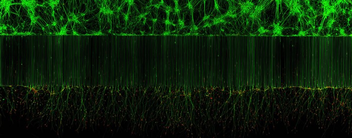 Juara kesepuluh diraih Melinda Beccari & Dr. Don W. Cleveland. Menampilkan gambar Neuron motorik tumbuh dalam perangkat mikrofluida untuk pemisahan badan sel (atas) dan akson (bawah).Β Hijau β mikrotubulus;Β Merah β kerucut pertumbuhan (aktin)Β Foto: Nikon Small World Photomicrography