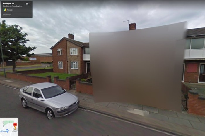 Sebuah rumah di Stockton-on-Tees, Inggris Salah satu rumah yang terletak di Princeport Road, Stockton-on-Tees, Inggris ini juga tidak bisa dilihat dengan jelas di Google Maps. Tidak ada penjelasan resmi mengapa rumah ini diburamkan, bahkan pemiliknya sendiri, Jane Allison, mengaku tidak tahu alasan Google melakukan hal itu. Beberapa spekulasi mengatakan bahwa rumah ini mungkin terlibat dalam kasus kriminal, atau mungkin pemilik sebelumnya meminta Google untuk menyembunyikannya. Foto: Brightside