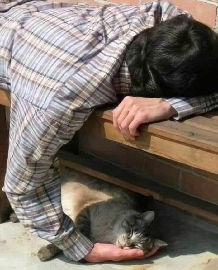 Sungguh baik hati pria ini, tidur sambil membelai kucing. Foto: Bored Panda