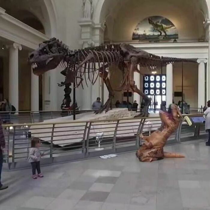 Apakah dinosaurus ini menertawakan nenek moyangnya yang sudah tinggal kerangka? Foto: Bored Panda