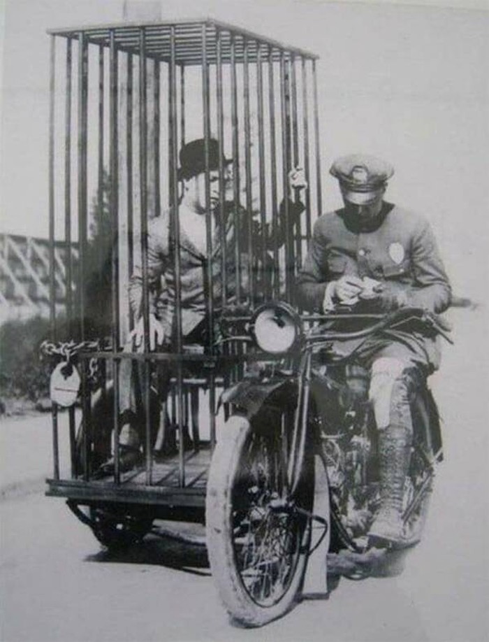 Meskipun sel penjara portabel ini tidak terlalu jauh berbeda dengan alternatif modern - diborgol di belakang mobil polisi tidaklah jauh berbeda - desain sepeda motor ini sangat menarik untuk dilihat. Sepeda motor yang digambarkan di sini berasal dari tahun 1920-an dan digunakan di Los Angeles. (Foto: allthatsinteresting)