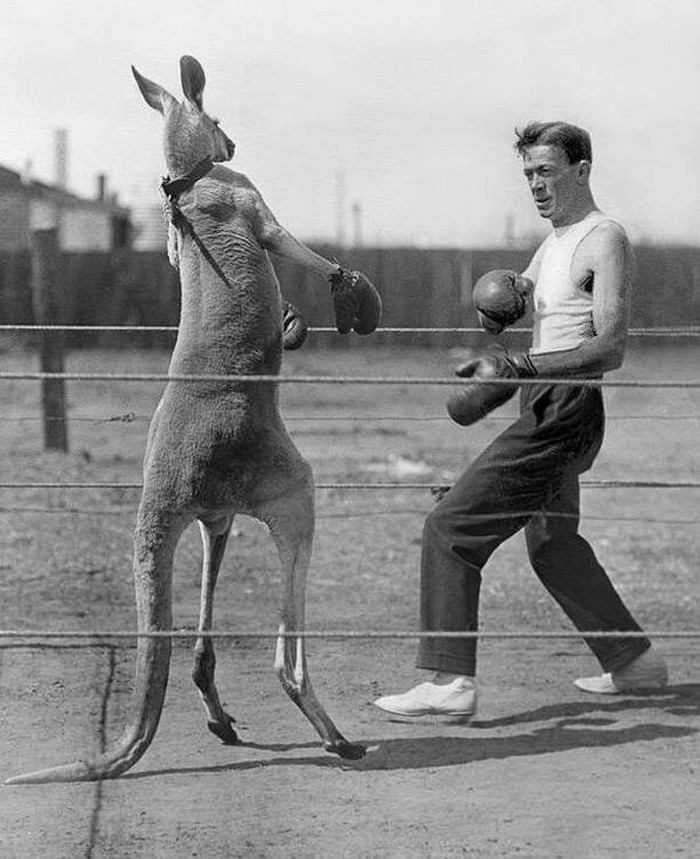 Meskipun terlihat seperti kartun, tinju kanguru sebenarnya sangat populer pada akhir 1800-an. Baik di Eropa maupun Amerika Serikat, badut dan petinju profesional akan bertanding melawan hewan berkantung ini di depan penonton hiruk pikuk. Pria yang terlihat dalam foto ini sedang bertanding dengan seekor kanguru di Berlin, Jerman pada tahun 1924. Beberapa dekade berikutnya, olahraga ini tidak lagi digemari karena banyak yang mengecam penyiksaan terhadap hewan. (Foto: allthatsinteresting)