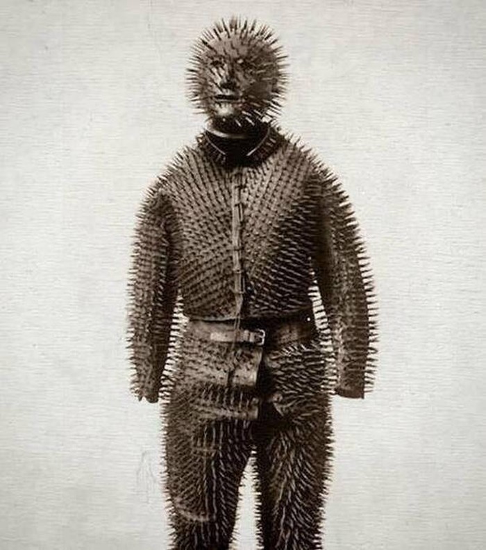 "Wildman Suit". Hingga hari ini, "Wildman Suit" yang unik ini dipajang di Menil Collection di Texas, yaitu eperangkat baju zirah berlapis ganda yang dilapisi dari kepala hingga kaki dengan paku besi sepanjang satu inci yang menghadap keluar. Setelan ini tetap menakutkan sekaligus misterius. Meskipun secara luas disebut sebagai baju zirah pemburu beruang Siberia dari tahun 1800-an, ada juga yang mengatakan baju ini digunakan dalam tontonan mengerikan memancing beruang yang populer di Inggris. Namun, tujuan sebenarnya dari "Wildman Suit" masih sulit dipahami hingga berabad-abad kemudian. (Foto: allthatsinteresting)