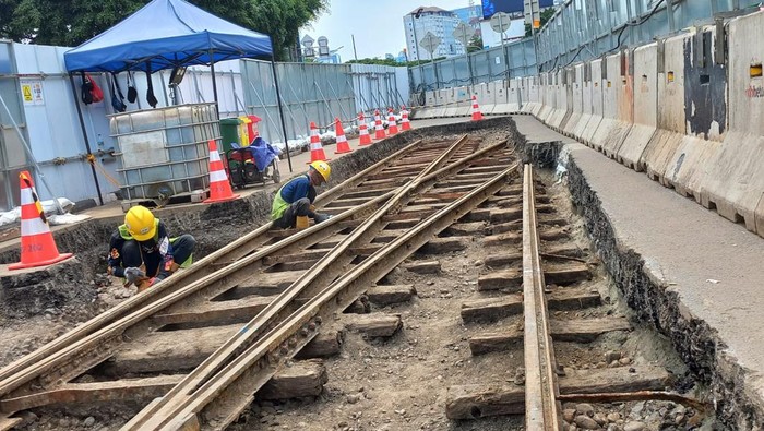 Rel trem yang ditemukan saat pembangunan MRT Jakarta fase 2. Foto: Anggi Muliawati/detikcom