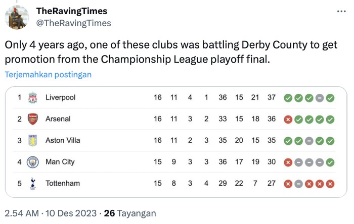 Beda dua poin antara Aston Villa dan pemuncak klasemen Liverpool di Liga Inggris. Foto: X