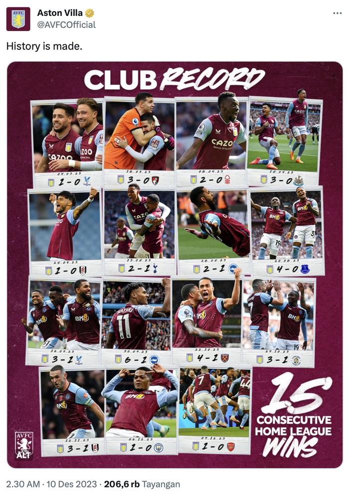 Potret kemenangan 15 secara berturut-turut Aston Villa. Foto: X