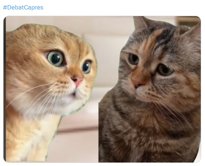 Meme kucing lucu banyak bertebaran dari netizen mengomentari Debat Capres 2024. Ada kandidat capres yang menyerang dengan argumen, ada yang yang harus membela diri. Foto: Twitter