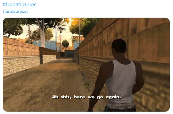 Meme GTA untuk menggambarkan suasana debat. Foto: Twitter