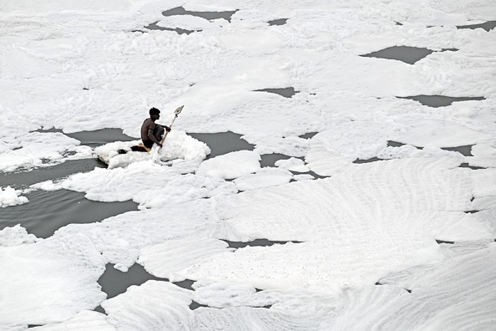 Sungai Yamuna sangat tercemar di bagian hilir New Delhi, ibu kota India, yang membuang sekitar 58% limbahnya ke sungai. Menurut laporan yang disampaikan oleh Komite Pengendalian Pencemaran Delhi dan Dewan Pengendalian Pencemaran Pusat (CPCB) kepada Komite Pengendalian Pencemaran Yamuna, setidaknya 90% air limbah domestik di kota tersebut mengalir ke Yamuna. Foto: REUTERS/ANUSHREE FADNAVIS