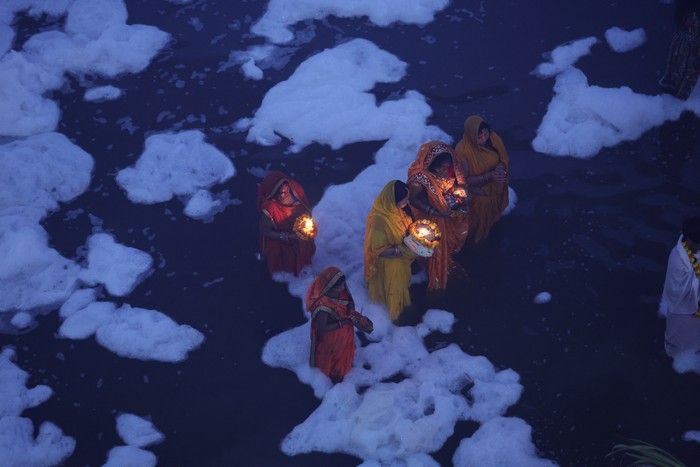 Di sana, sering diadakan perayaan yang dikenal dengan Festival Chhath Puja, di mana masyarakat akan mengabdikan diri dengan membenamkan tubuh ke air Sungai Yamuna. Foto: REUTERS/ANUSHREE FADNAVIS