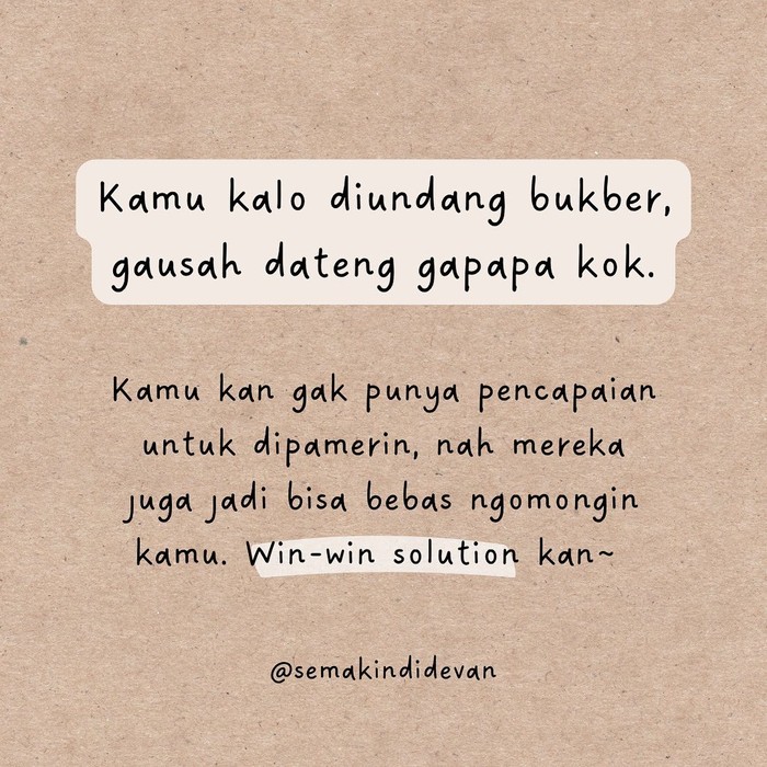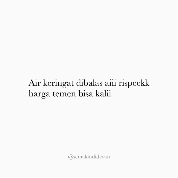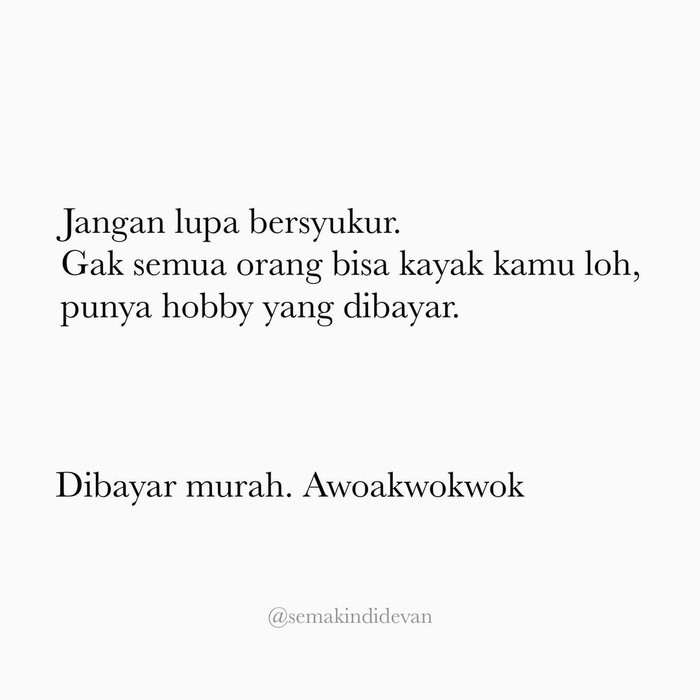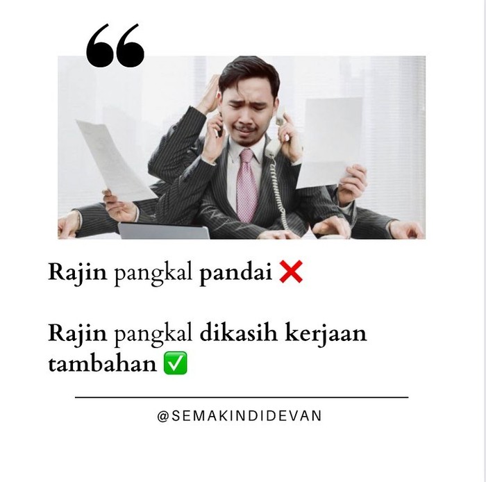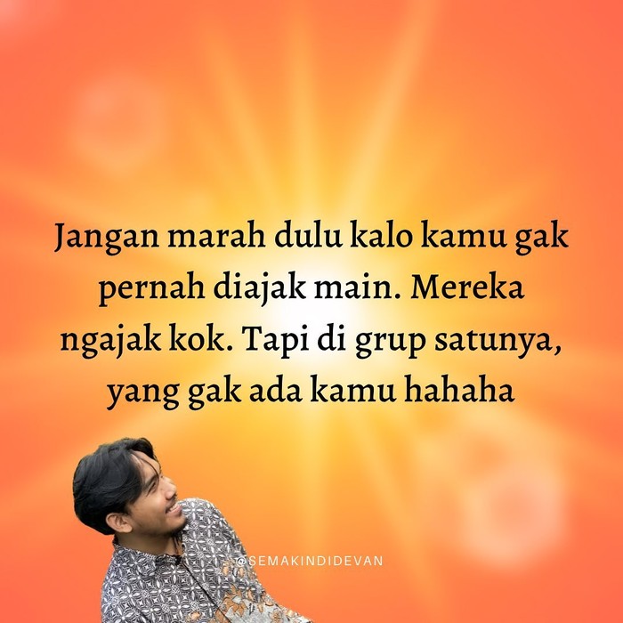 FotoINET Quotes Kocak Devan 'Demotivator' Yulio, Tetap Menyerah, Jangan Semangat! Pool - detikInet Kamis, 28 Des 2023 12:46 WIB Tautan telah disalin Jakarta - Quotes dari Devan 'Demotivator' ini bakal bikin kamu kesindir dan ketawa pahit sendiri. Asem, pas banget. Ternyata begitu. Foto: Instagram/semakindidevan Aowkaowkaowk, namanya juga hidup. Foto: Instagram/semakindidevan Bukber ada atau nggak ada kamu, bakalan nggak ada bedanya. Foto: Instagram/semakindidevan Cari duit gini amat. Foto: Instagram/semakindidevan Harga temen tapi kadang suka nggak ngotak. Foto: Instagram/semakindidevan Jadi, jangan terlalu rajin. Foto: Instagram/semakindidevan Tetap saja yang kaya bos-bos kalian, jaaaah. Foto: Instagram/semakindidevan Sungguh kalimat demotivasi. Foto: Instagram/semakindidevan Grupnya fokus buat ngomongin kamu doang lagi. Foto: Instagram/semakindidevan (/) TAGS quotes fotoinet meme lucu LIHAT LAINNYA Tautan telah disalin