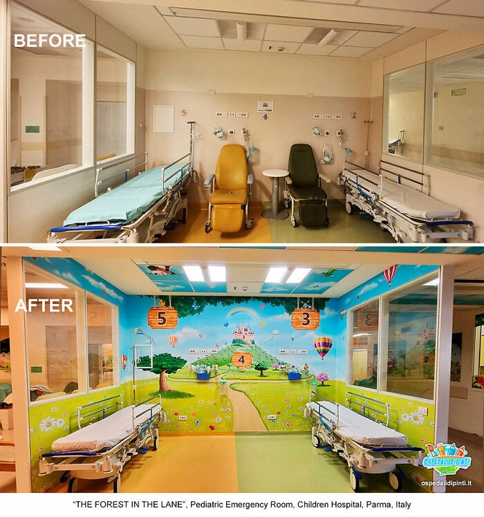 Seorang seniman coba membuat ruangan di RS terasa lebih nyaman lewat mural. Hasilnya bisa dilihat pada foto sebelum dan sesudah berikut ini, bikin takjub.