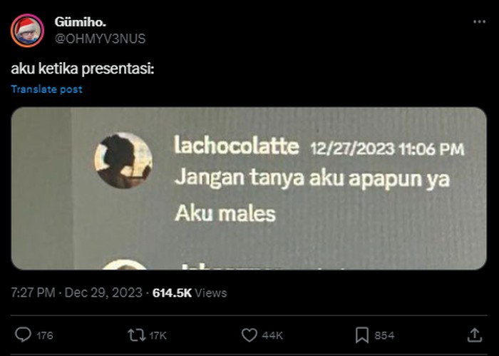 Paling mager ya ditanya saat presentasi di depan kelas selesai. Foto: (Twitter).