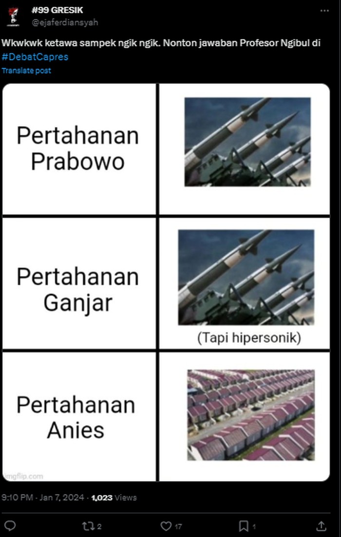 Saat Prabowo dan Ganjar bahas senjata, Anies bahas soal rumah. Mungkin itu karena capres nomor urut satu ini sangatΒ ingin tentara di Indonesia sejahtera. Foto: (Twitter).