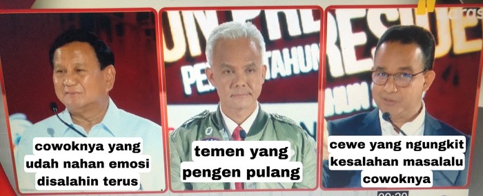 Debat capres semalam menghadirkan perdebatan sengit antar calon. Anies Baswedan, Prabowo Subianto dan Ganjar Pranowo pun tak lepas dari meme buatan netizen.