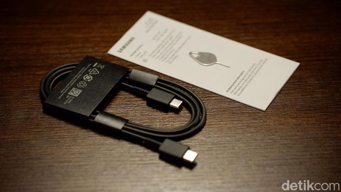Seperti sebelumnya Samsung memberikan kabel data USB-C, kertas petunjuk dan SIM Card injector. Foto: Adi Fida Rahman/detikINET
