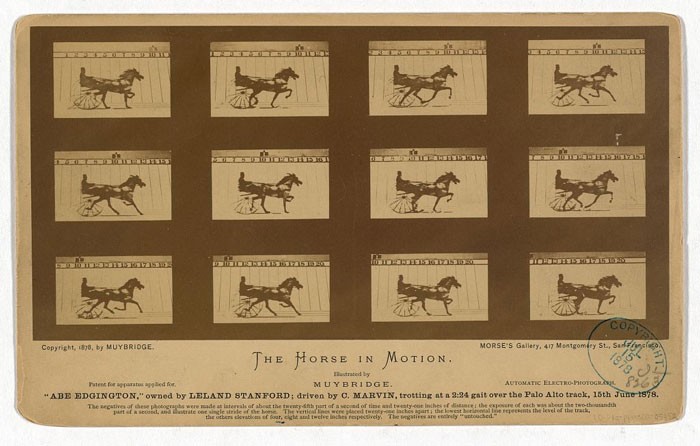 Foto bergerak pertama. Eadweard Muybridge memelopori seni mengabadikan gerakan dalam foto dengan menggunakan satu set kamera yang dipicu satu demi satu. Foto bingkai demi bingkai ini, diambil di Palo Alto, California, sangat penting dalam memajukan teknologi gambar bergerak. Foto: Boredpanda