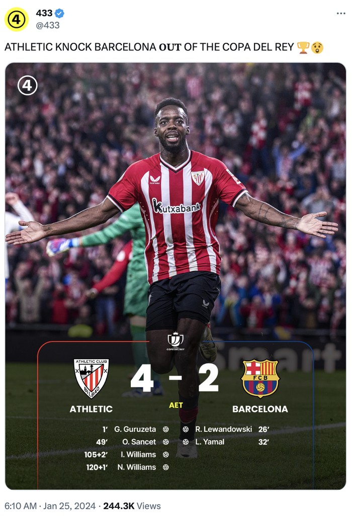 Barcelona secara mengenaskan tersingkir dari ajang Copa del Rey. Mereka dilibas Atletico Bilbao dengan skor akhir 4-2. Foto: X