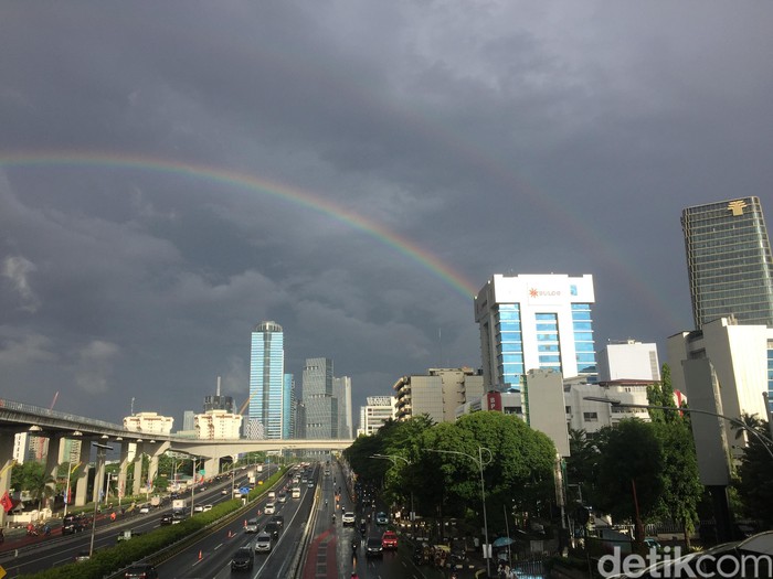β€œLokasi JPO Tegal Parang sekira jam 7.00 WIB. Kondisi gerimis lembut tapi ada Matahari dari sisi timur, langit barat dan utara gelap,” lapor Uyung, salah satu pembaca detikcom yang mengabadikan momen tersebut.Β Foto: AN Uyung Pramudiarja/detikcom
