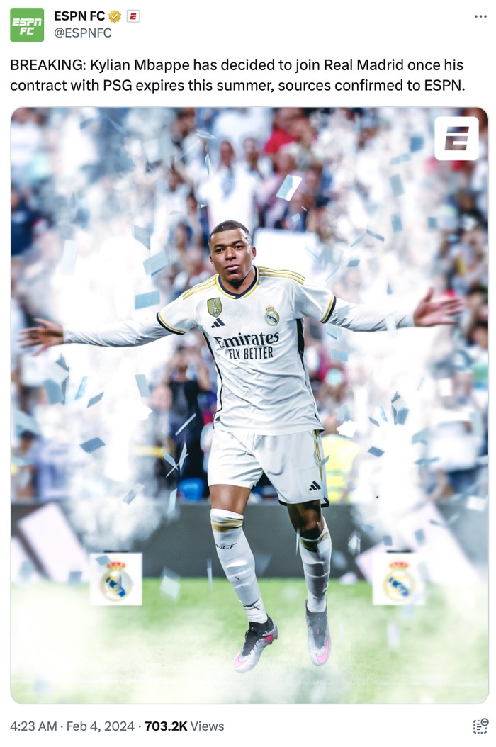 Rumor transfer Mbappe ke Madrid disebutkan sudah mencapai kata sepakat. Pemain Prancis itu akan gabung dengan tim Ibu Kota Spanyol pada musim panas tahun ini. Foto: X