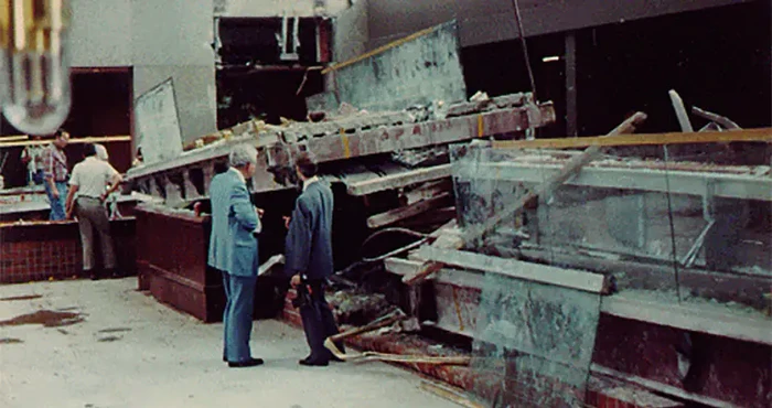 Bencana itu terjadi di hotel Hyatt Regency Kansas City di Missouri. Pada tanggal 17 Juli 1981, dua jalan setapak yang berdekatan runtuh tepat di lobi hotel. Saat itu, hotel mengadakan pesta dansa teh dan lebih dari 1.600 orang berkumpul di lobi. Dilaporkan, 114 orang tewas dan lebih dari 216 orang luka-luka. Selain itu, kerugian harta benda yang diakibatkannya berkisar beberapa juta dolar.Rupanya, para konstruktor menemukan cacat desain selama pembangunan hotel. Mereka memutuskan untuk memperbaikinya sedemikian rupa sehingga mengakibatkan dua jalan setapak di lantai dua dan empat berdekatan sehingga menyebabkan pembebanan ganda pada atap atrium.Foto: Unbelivable Facts