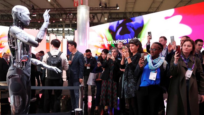 Robot AI berinteraksi dengan publik, di Mobile World Congress (MWC) 2024. Aplikasi kecerdasan buatan (artificial intelligence/AI) di seluruh perangkat dan jaringan, kemajuan teknologi 5G dan 6G serta peningkatan konektivitas jadi salah satu topik utama pada ajang tahun ini. Β