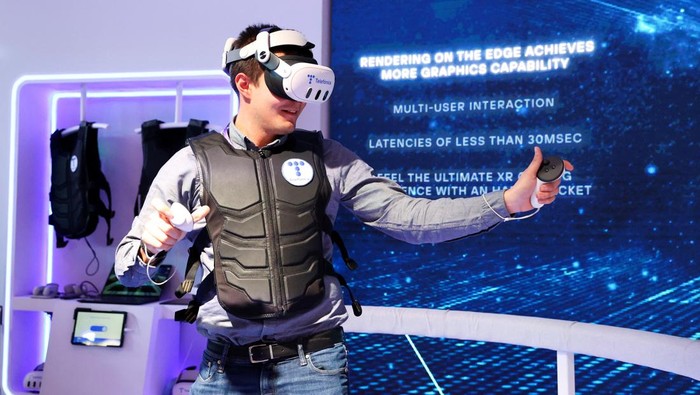 Seorang pria memainkan video game dengan headset realitas virtual Meta. Ajang MWC tahun ini menghadirkan sekitar 2.400 peserta pameran dan 1.100 pembicara. Termasuk hampir 300 perusahaan asal China seperti China Mobile, China Telecom, Huawei, ZTE, Lenovo, Xiaomi, dan iFlytek. Β