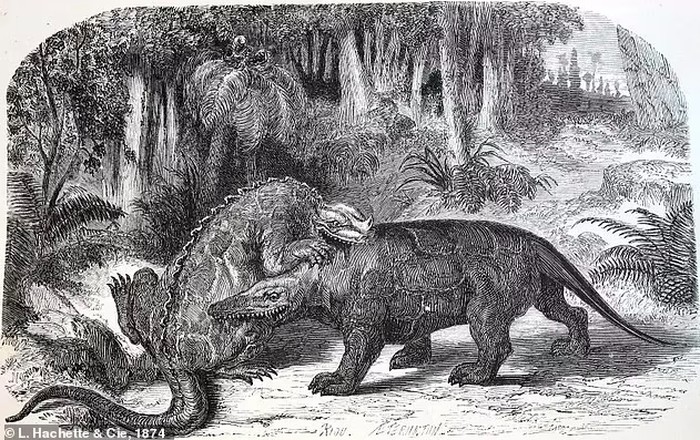 Dinosaurus pertama yang pernah ditemukan adalah Megalosaurus dan Iguanodon, yang digambarkan di sini dalam ilustrasi tahun 1863. Ilmuwan awal mengira hewan-hewan ini adalah kadal raksasa, dan lebih mirip badak bersisik daripada dinosaurus yang kita pahami sekarang. Foto: via Daily Mail
