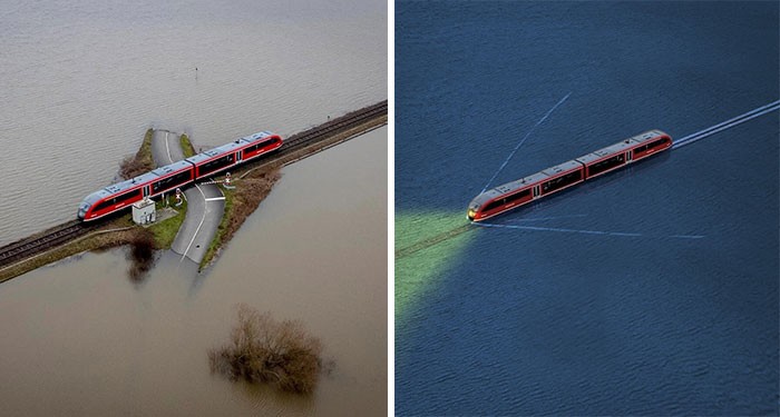 Kereta Ini Dikelilingi Oleh Tanah Banjir. Diedit menjadi seperti film Spirited Away Foto: Reddit via Boredpanda