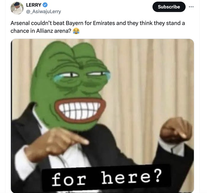 Akun ini meragukan apakah Arsenal nanti mampu berbicara banyak di kandang Bayern. Foto: Twitter
