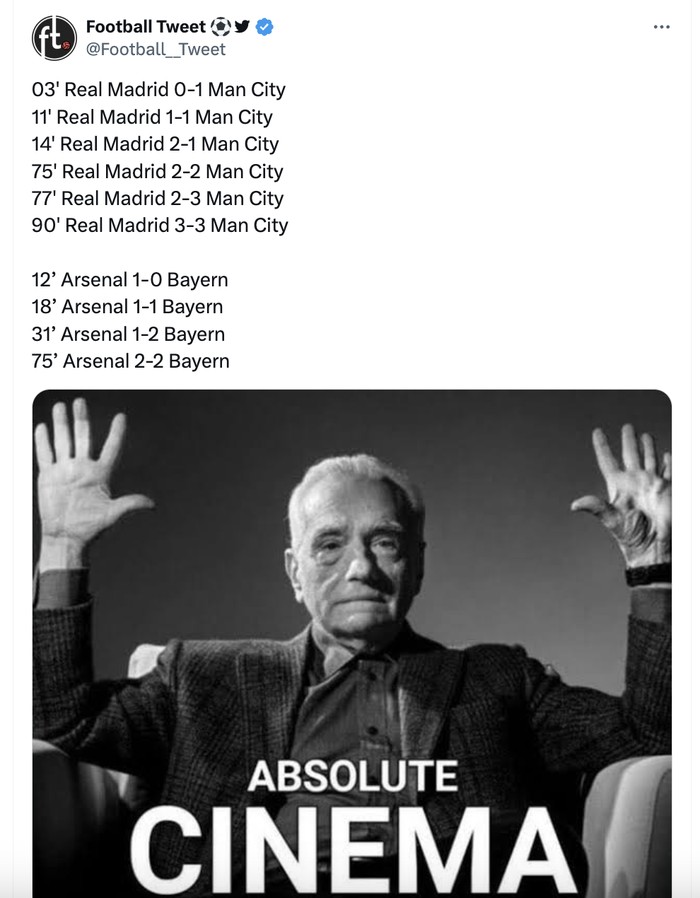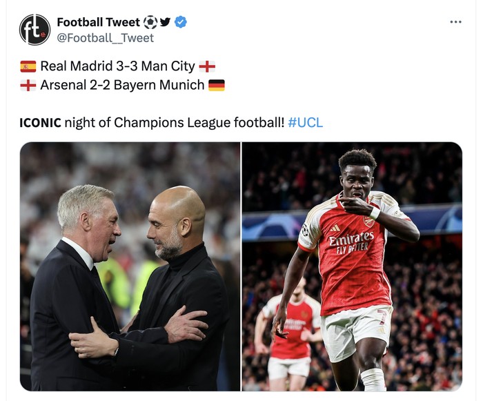 Baik laga Real Madrid vs Manchester City dan Arsenal lawan Bayern Munich bikin penonton merinding. Foto: Twitter