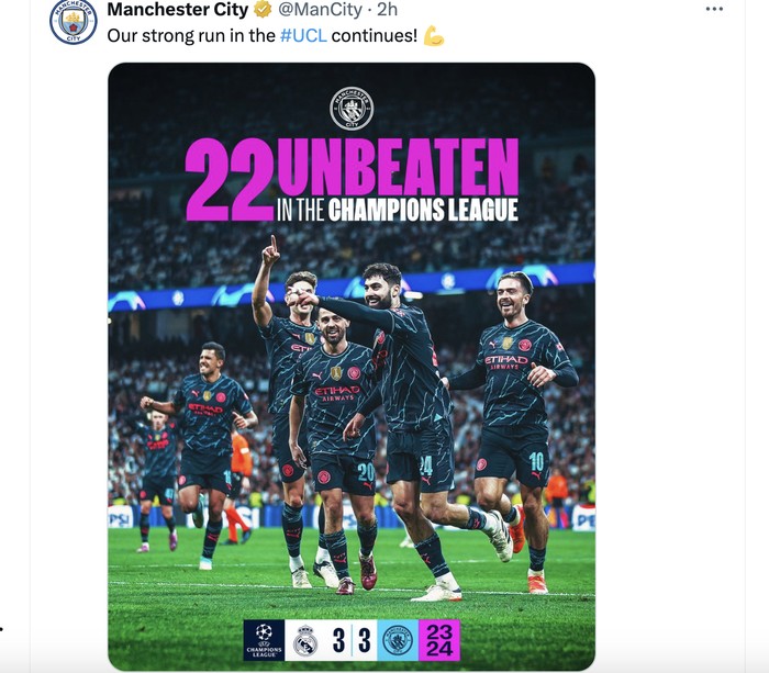 Akun City membanggakan pencapaian timnya yang tak terkalahkan di Liga Champions. Foto: Twitter