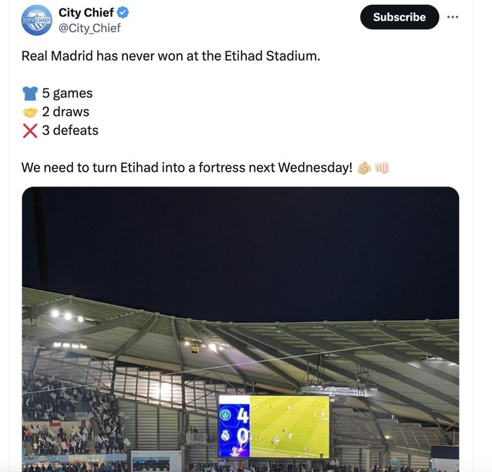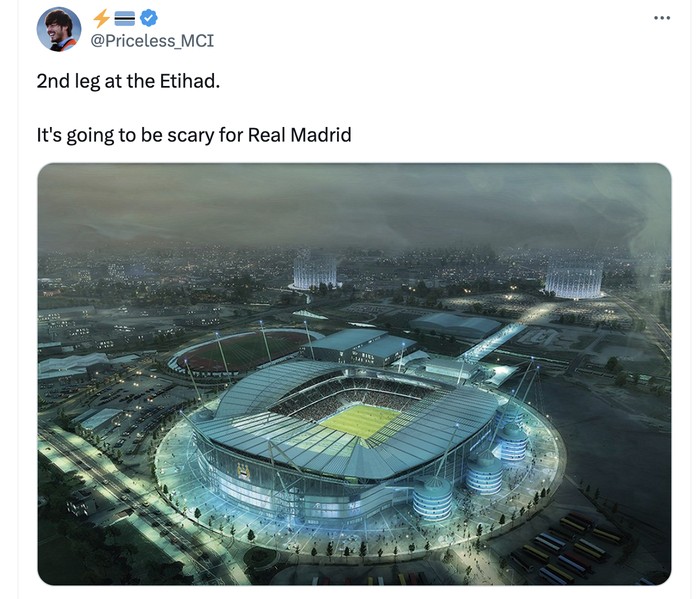 Etihad memang menakutkan bagi Real Madrid. Foto: Twitter