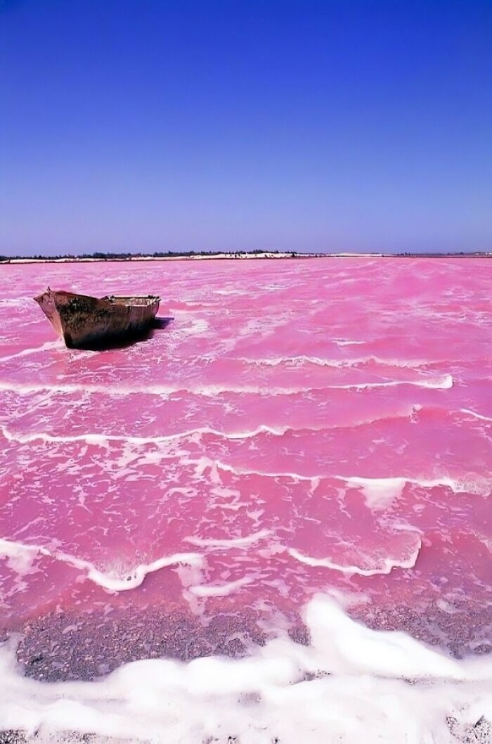 Di Senegal terdapat Danau Retba. Warna Pinknya Yang Berbeda Disebabkan Bakteri Dunaliella Salina Yang Tertarik Dengan Kandungan Garam Danau Foto: Boredpanda