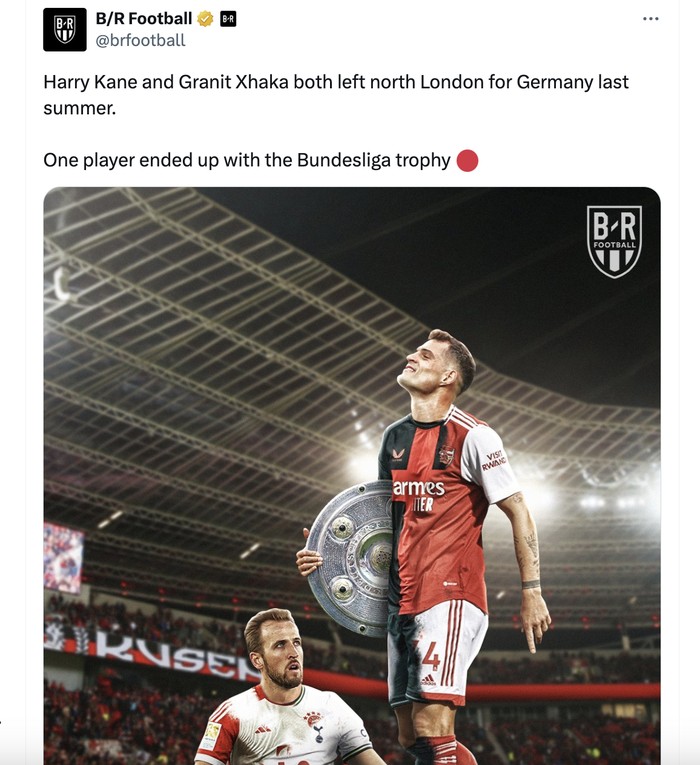 Harry Kane dan Granit Xhaka sama-sama meninggalkan Liga Inggris Ke Bundesliga, tapi hanya Xhaka yang juara. Foto: Twitter