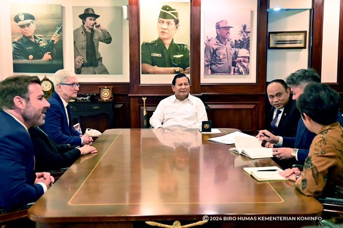 Inilah momen pertemuan Tim Cook dengan Prabowo yang juga capres terpilih dalam Pemilu 2024. Tim Cook didampingi oleh Menkominfo Budi Arie Setiadi. Foto: Biro Humas Kominfo