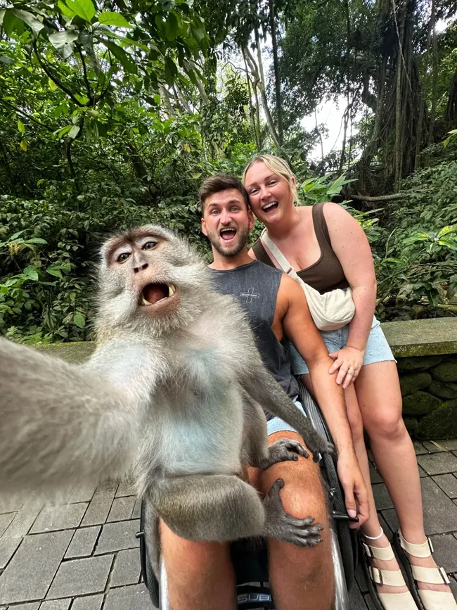 Momen langka, monyet ekor panjang selfie dengan pasangan bule di Bali. Foto tersebut diambil ketika Chloe Dennis dan Craig, suaminya, mengunjungi Ubud Sacred Monkey Forest. Awalnya, mereka ingin berfoto dengan banyaknya monyet di sana, tapi siapa sangka monyetnya sendiri yang mengambil kamera dan berpose manis bersama mereka. Foto: via Caters News Agency