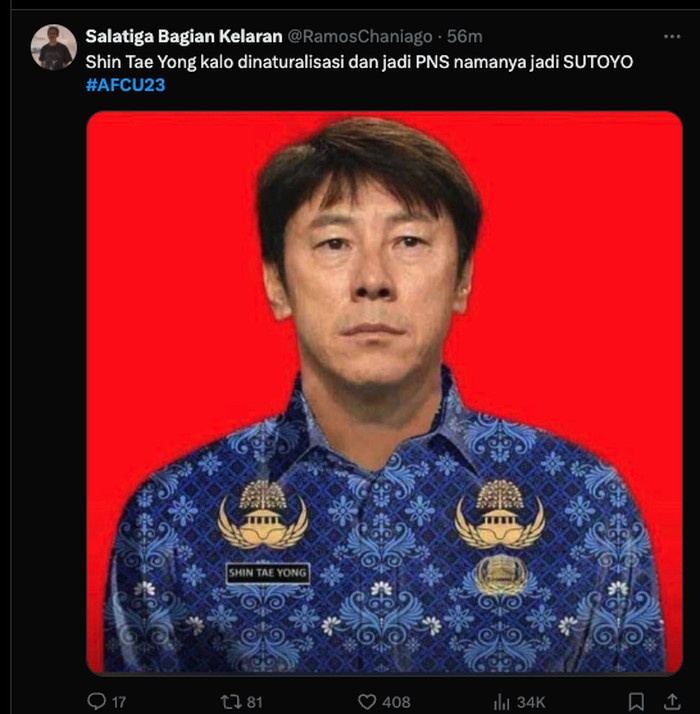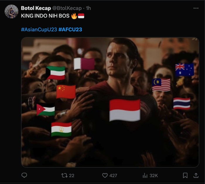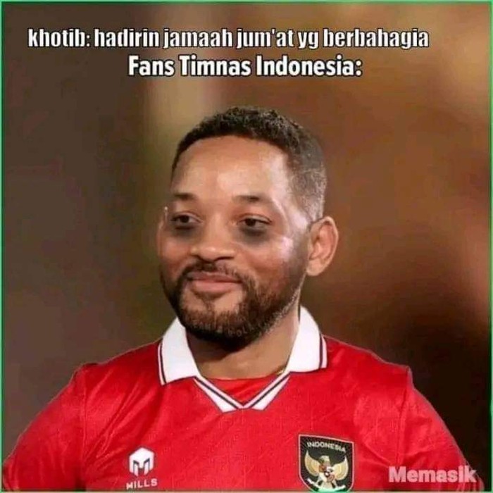 Setelah pertandingan yang menegangkan, netizen Indonesia langsung membanjiri platform media sosial dengan meme-meme yang menggambarkan kegembiraan mereka. Salah satu meme yang paling menonjol adalah gambar jemaah Salat Jumat yang tersenyum lebar dengan teks βJemaah yang berbahagiaβ yang menunjukkan kepuasan mereka setelah kemenangan Timnas Foto: Twitter @idextratime